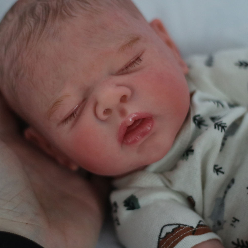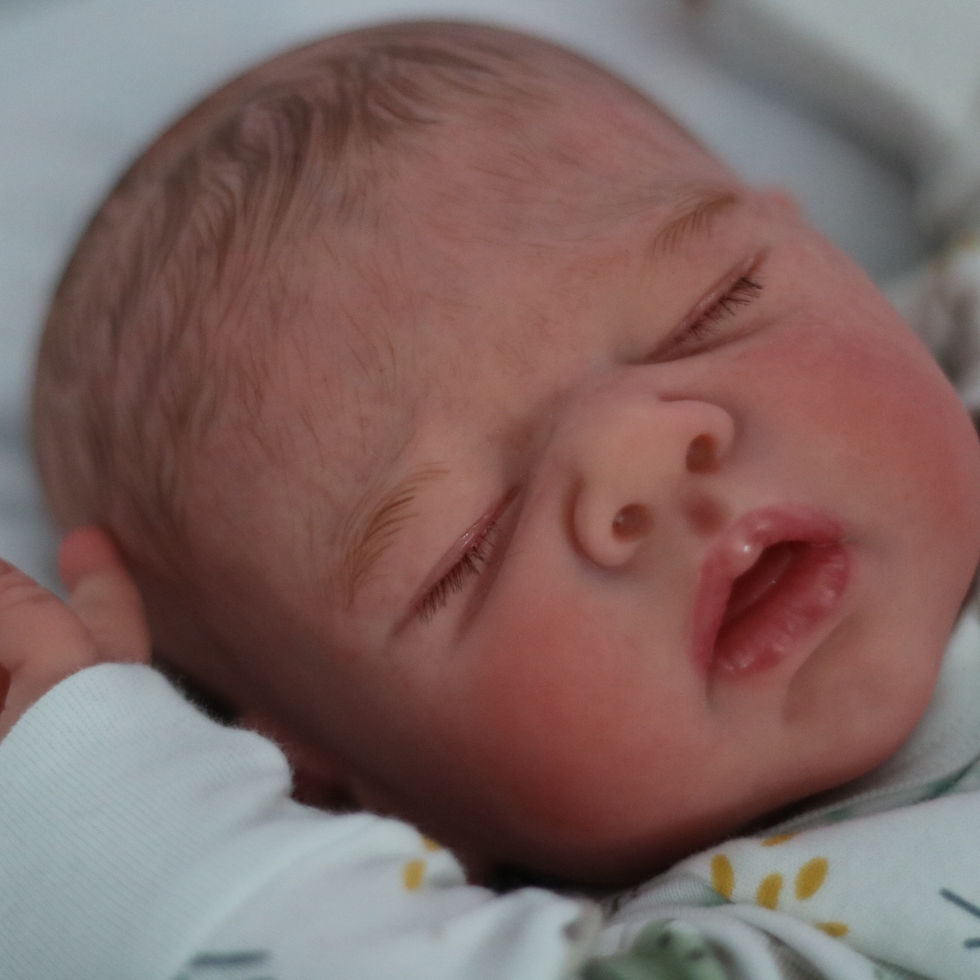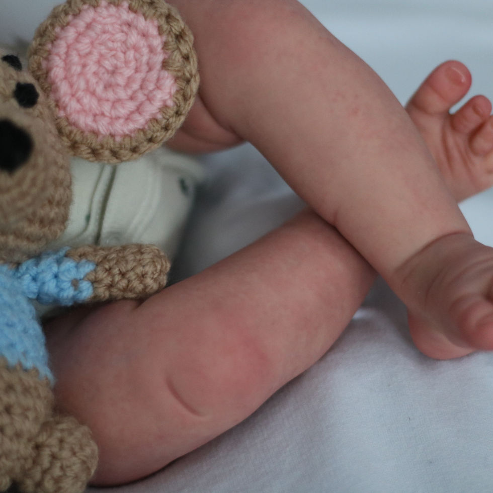 Erin has 3/4 arms and legs. He is weighted to feel like holding a real baby. He is scented with baby scent. He has painted hair and a weighted cloth body. Erin sculpt is not gendered so can be changed to the gender of your choice. This one will come home with boy accessories including a couple outfits, hat, luvy, diapers, a modified soother to fit his mouth, coa and a blanket. He is just under 5 lbs.