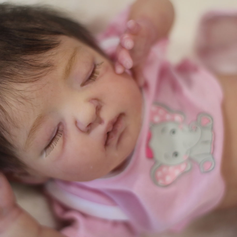 Gin Blossom is 13 inches long. She has a full body armature. She poses very nicely. Was sculpted by Laurie Sullivan Roy. She will go home with an outfit and blanket and coa. She is poured in very soft silicone. Her mouth will be open for an optional soother.